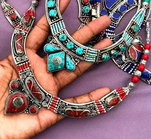 Our collection features authentic Nepali designs, from intricate silverwork to vibrant gemstones like turquoise, coral, and lapis lazuli, each holding deep cultural significance. Whether you seek a statement necklace, elegant bangles, or delicately crafted earrings, our jewelry reflects the beauty of Nepal’s artistry and craftsmanship.