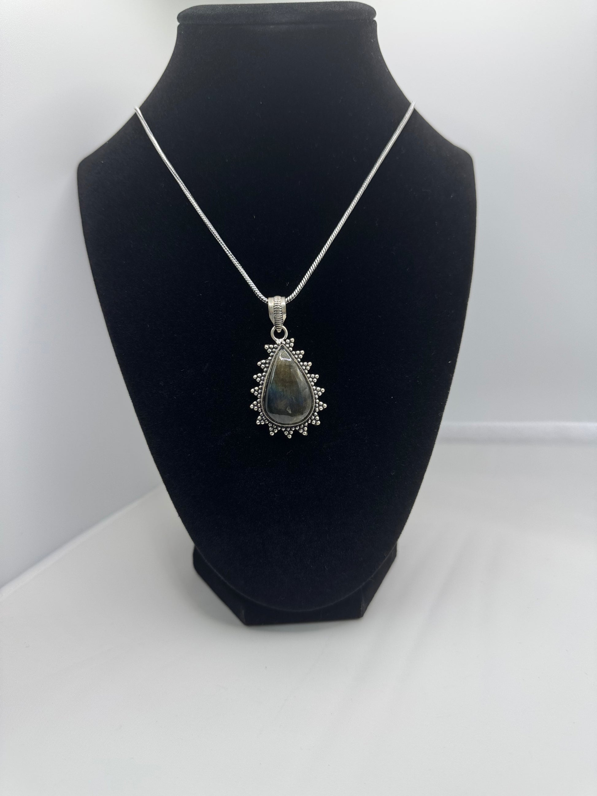 Labradorite pendant featuring the stone's characteristic play-of-color, known as labradorescence. This iridescent gemstone displays flashes of blue, green, and gold as light moves across its surface. Labradorite is traditionally valued for its protective properties and is believed to enhance intuition and spiritual awareness. A versatile piece suitable for both everyday wear and special occasions, this pendant makes an elegant addition to any jewelry collection.